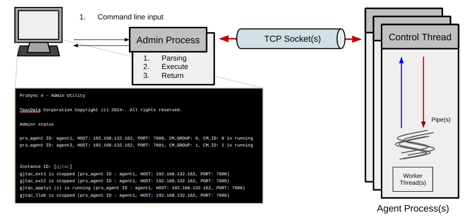 ProSync Admin Utility는 ProSync의 효율적인 사용을 위한 대화형 유틸리티이다. 해당 유틸리티로 ProSync의 프로세스 기동, 정지, 일시정지와 같은 관리를 할 수 있다. 또한, ProSync 관리자는 시스템 관리를 위한 명령을 실행할 수 있다.