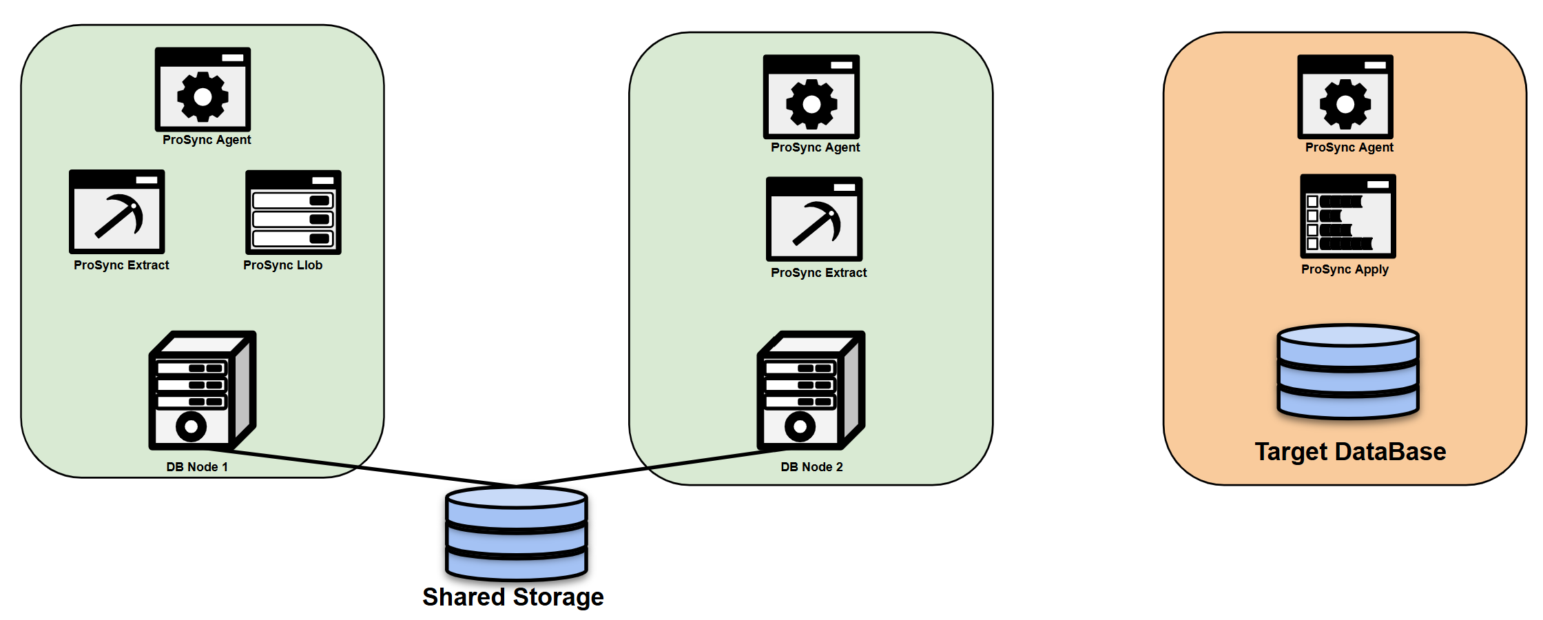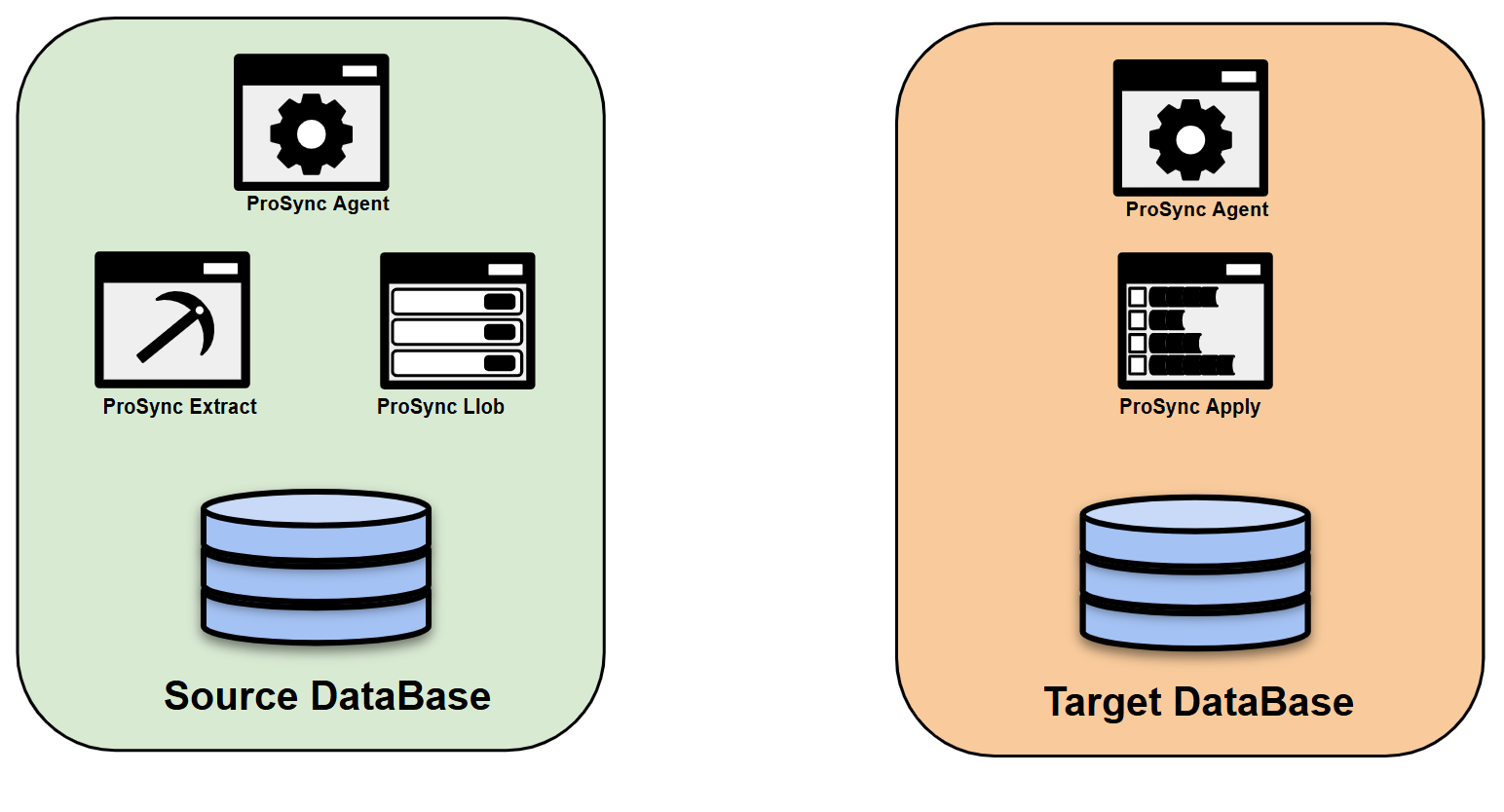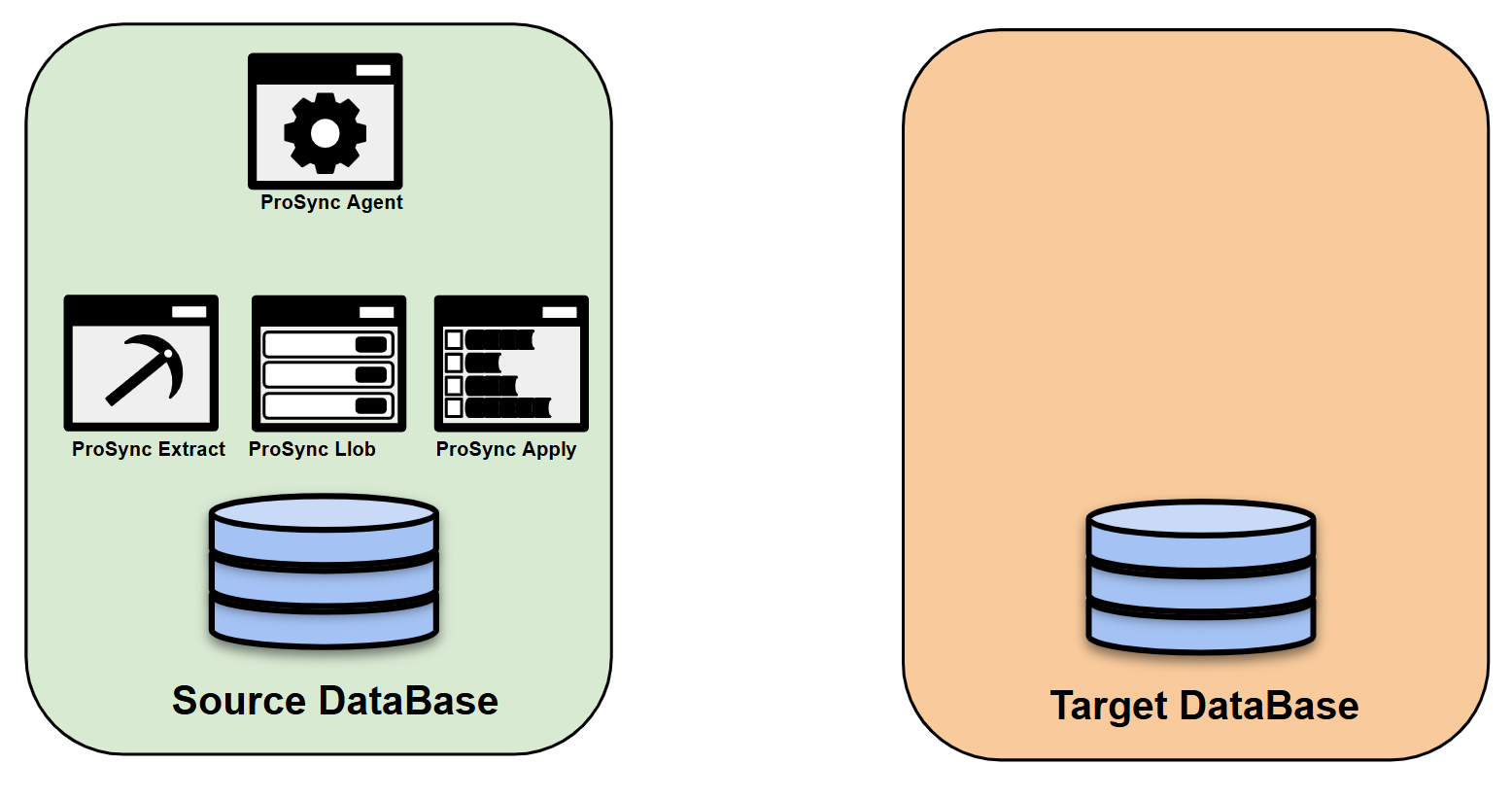 가장 기본적인 프로싱크의 구성도로, 추출하고자 하는 위치에 관련 프로세스가 기동되고, 반영하고자 하는 위치에 반영프로세스가 기동되는 구조이다. Agent 프로세스의 경우 프로세스들을 모니터링하기 때문에 환경별로 1개씩 기동된다.