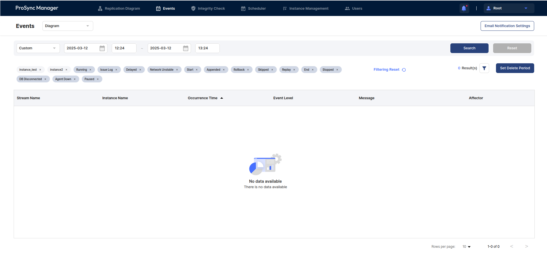The users can search for events that have occurred by filtering by specific Instance and Event Status.