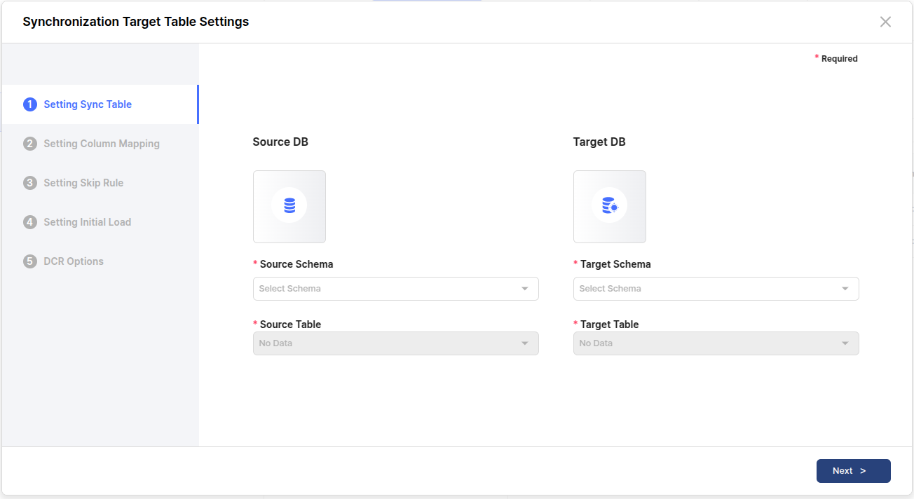 Select the Schema and Table in each DB that the users want to set the synchronization target table.