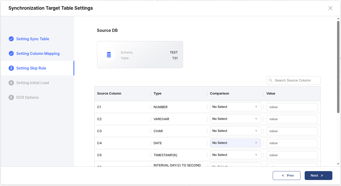 The Comparison selection range may vary depending on the Column Type, and the users cannot set the Skip Rule if the users specified Column Mapping in the previous step.