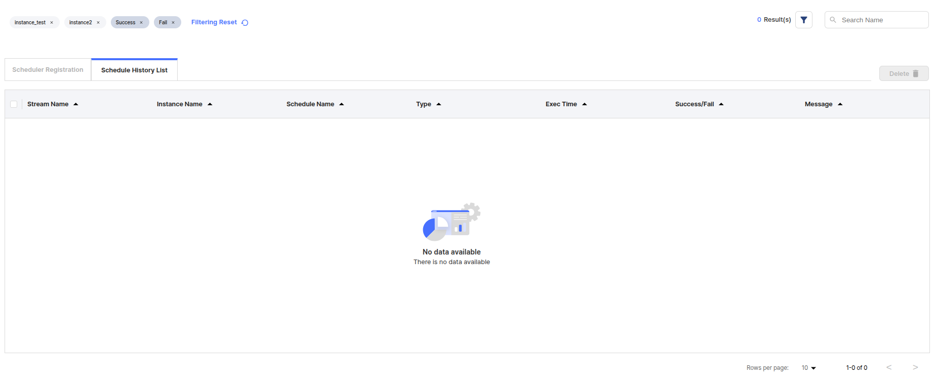 The users can search the schedule history by filtering by specific instance, scheduler status, and schedule name.