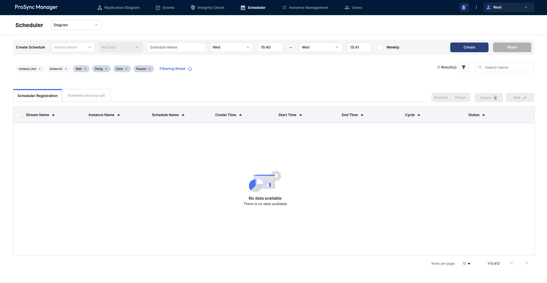 The users can search among the created schedules by filtering by specific Instance, Scheduler status, and Schedule name.