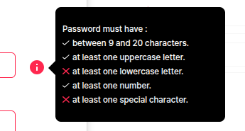 이 때 password 입력 칸의 인포 아이콘을 통해 비밀번호 설정 조건을 확인할 수 있으며, 충족된 조건과 그렇지 않은 조건을 확인할 수 있다.