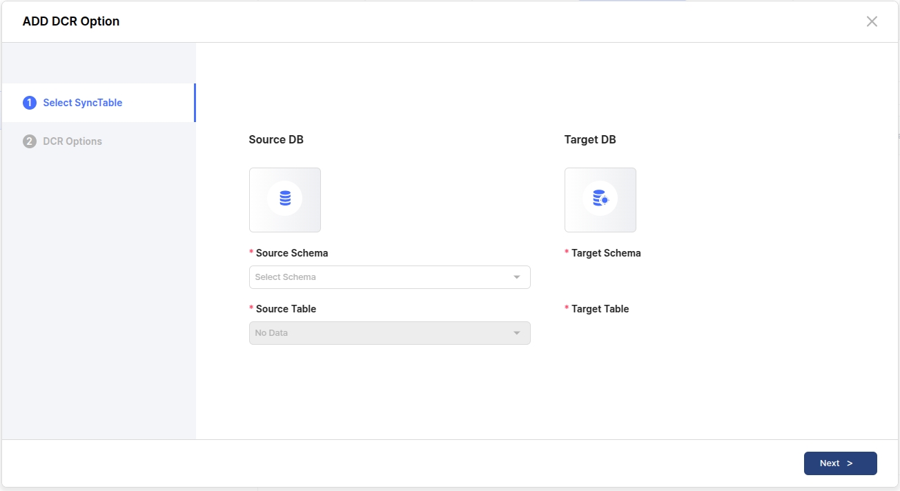 동기화 대상 테이블로 지정된 Table 중 DCR Option을 설정하고자 하는 Table을 Source DB를 기준으로 선택한다.
