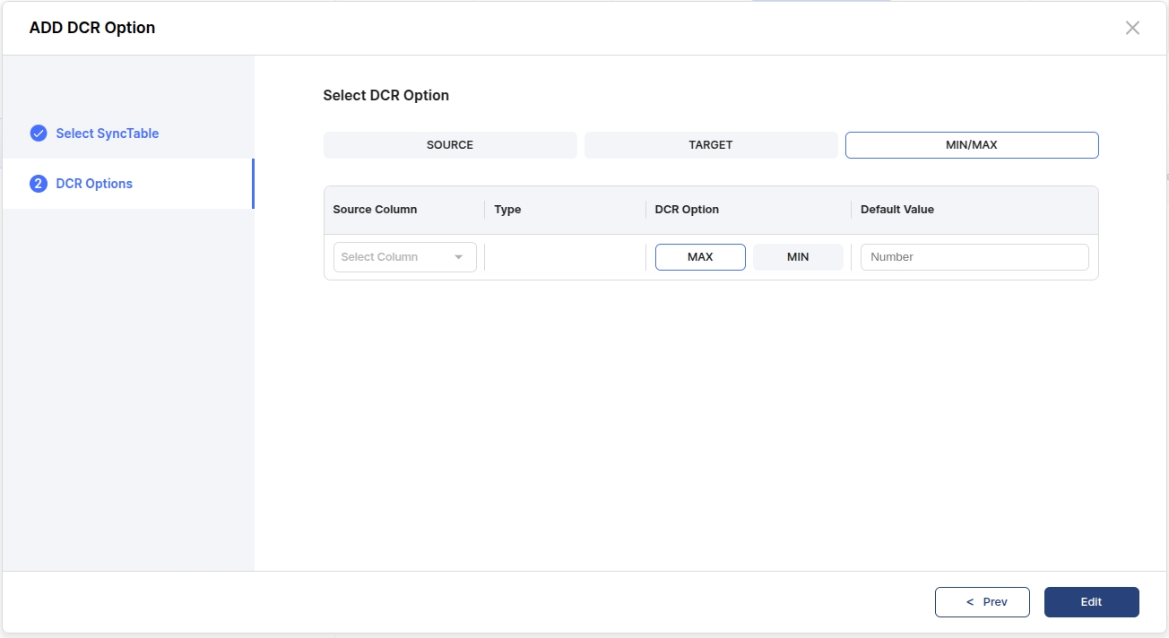 DCR Option으로 설정하고자 하는 Source table의 column을 선택한다.