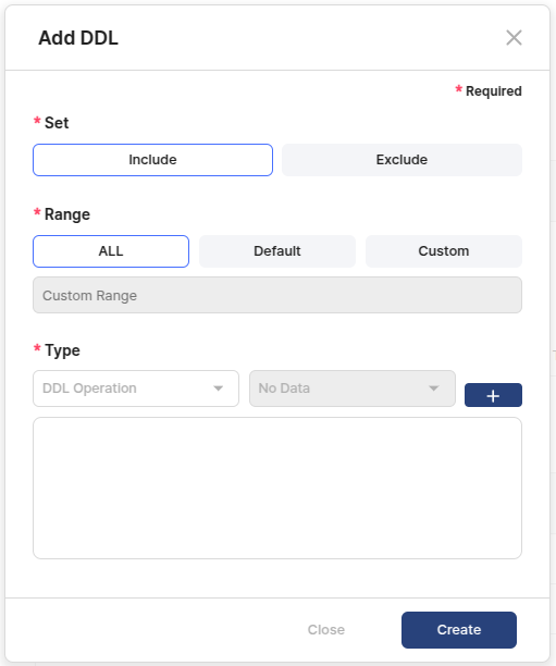 DDL 명령어 종류와 명령어의 대상 Object를 선택한다. 옆의 추가 버튼으로 추가가 가능하며, 여러 개의 Type을 추가할 수 있다. 이 때 Rule Sequence는 동일한 값을 가진다.