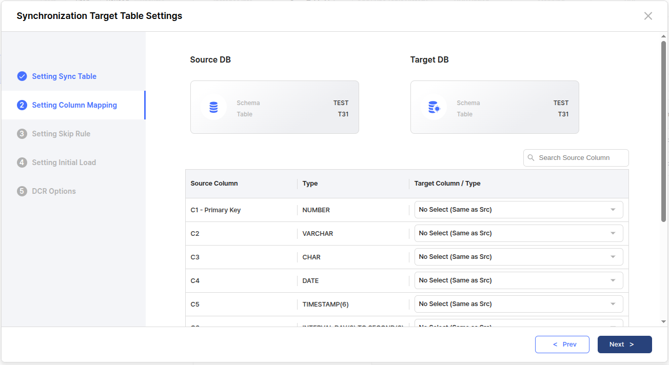 ProSync는 기본적으로 Source Table의 컬럼과 Target Table의 컬럼의속성이 동일하다고 가정한다.