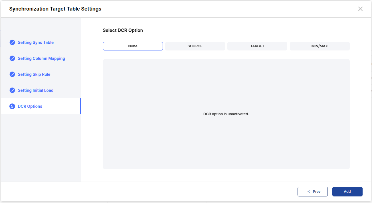 Source Table을 기준으로 DCR Option을 설정한다.