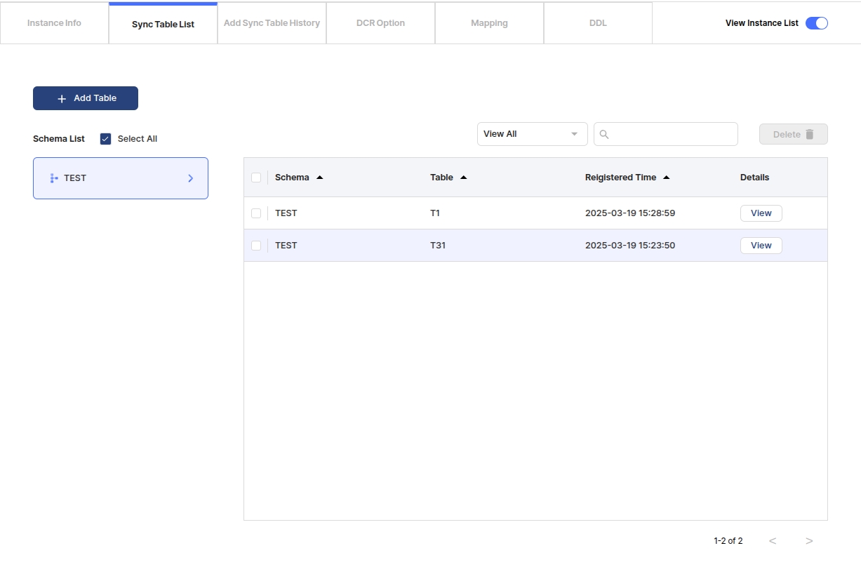 해당 Instance의 동기화 대상 테이블 목록을 확인할 수 있다.
