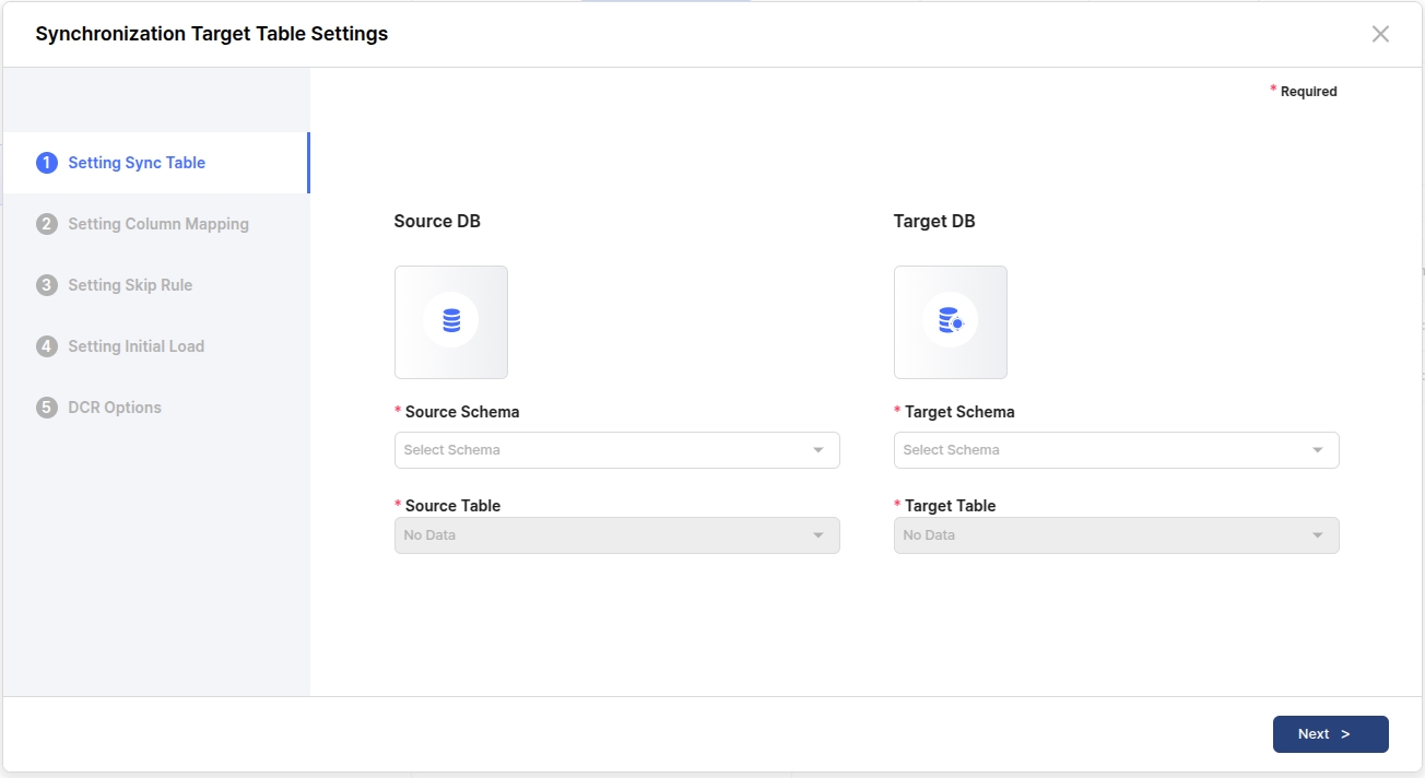 동기화 대상 테이블을 설정하고자 하는 Schema 및 Table을 각각의 DB에서 선택한다.