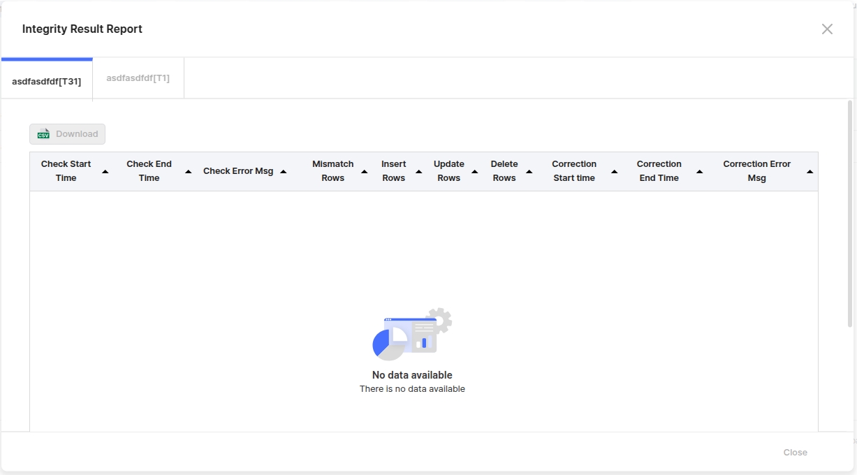 Result Report 를 다운로드 하여 관리할 수 있으며, Integrity_Report_[Job Name].csv 과 같은 이름을 가진다.