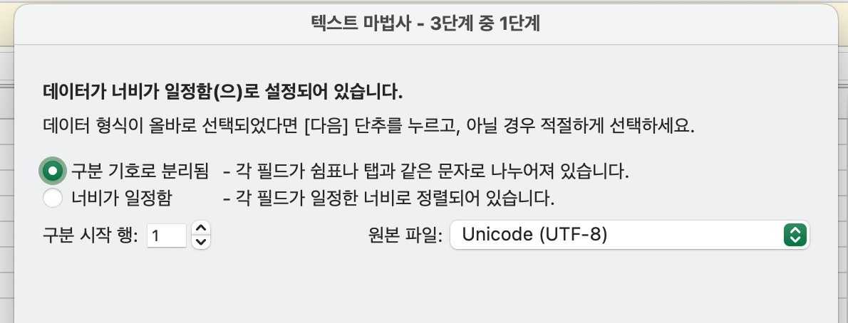 위와 같은 단계로 파일을 open 해야 데이터의 손상 및 구분자 상이한 현상 없이 데이터 확인이 가능하다.