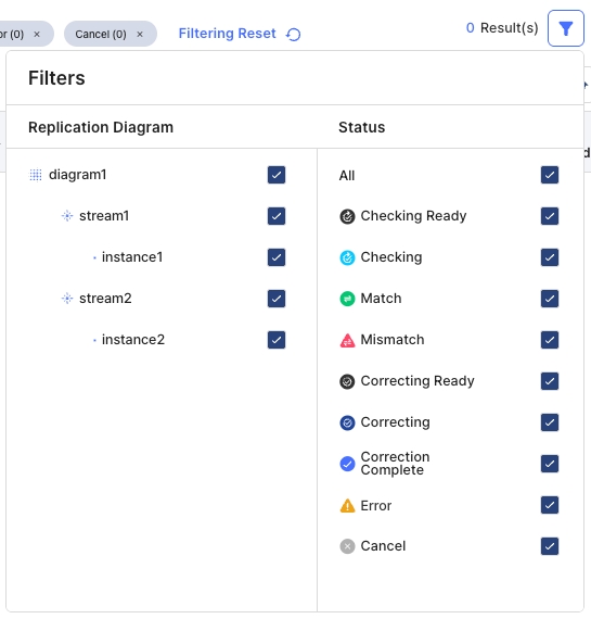 동기화 중인 Source와 Target DB의 특정 테이블에 대해 데이터 정합성이 일치하는지 검사하며, 정합성이 일치하지 않는 경우 정합성 검사 결과를 확인하거나 보정할 수 있다.