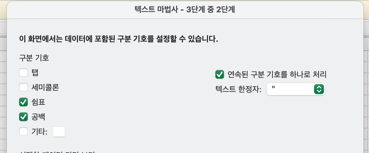 쉼표, 공백및연속된 구분 기호를 하나로 처리선택 텍스트 한정자 - '"'(쌍따옴표) 선택