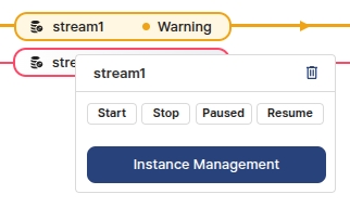 Line의 Stream 영역을 클릭하면 해당 Stream의 이름 및 삭제, status 변경 기능, Instance Management 페이지로 이동할 수 있는 Stream Box가 나타난다.