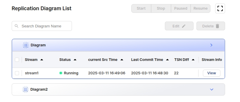 Delete: Replication Diagram 에 속해있는 Stream 을 지울 수 있다. 이 때, Replication Diagram 안에 어떠한 Stream 도 존재하지 않으면 Diagram 도 같이 삭제된다.