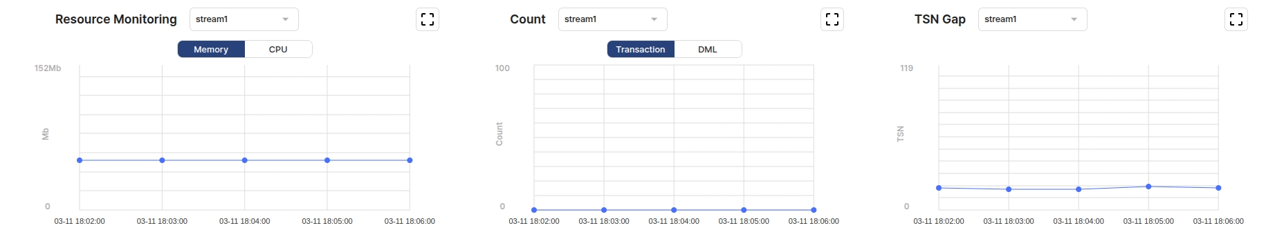 선택된 Diagram에 속한 Stream 단위로 Memory 및 CPU 사용량, 동기화 중에 발생한 Transaction과 DML count, 동기화가 진행되면서 축적된 TSN Gap 등 ProSync가 동기화 중 사용하는 Resource 지표를 확인 할 수 있는 영역이다.