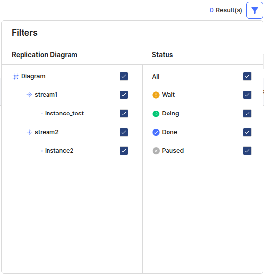 Filtering 조건으로 선택/해제하고자 하는 Instance를 선택한다. 어느 한 Stream에 속한 모든 Instance를 선택/해제하고 싶다면 Stream을, 현재 Diagram에 속한 모든 Instance를 선택/해제하고 싶다면 Diagram을 선택한다.