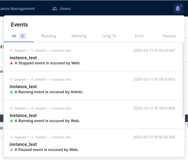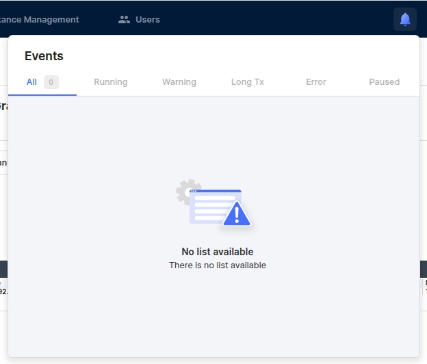 Event의 Status에 따라 All, Running, Warning, Long Tx, Error, Paused 탭으로 구분 가능하며, 해당되는 status 의 갯수가 탭에 나타난다.