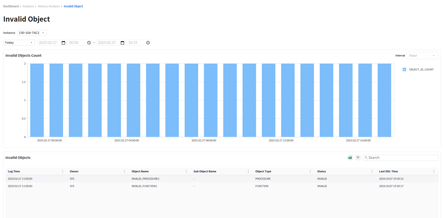 The Invalid Object page displays the Invalid Objects Count data and detailed information about invalid objects.