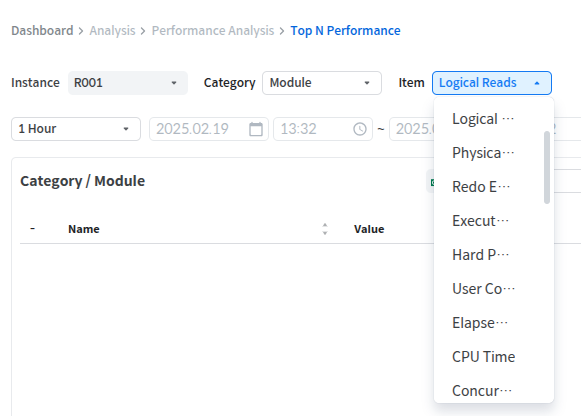 By selecting Category and Item, the users can view performance metrics for the monitoring period. At this time, the users can specify the number of items in the sort list (ALL / Top 20 / Top 30 / Top 50) for categories other than SQL Category using the combo box in the upper-right corner of the area.