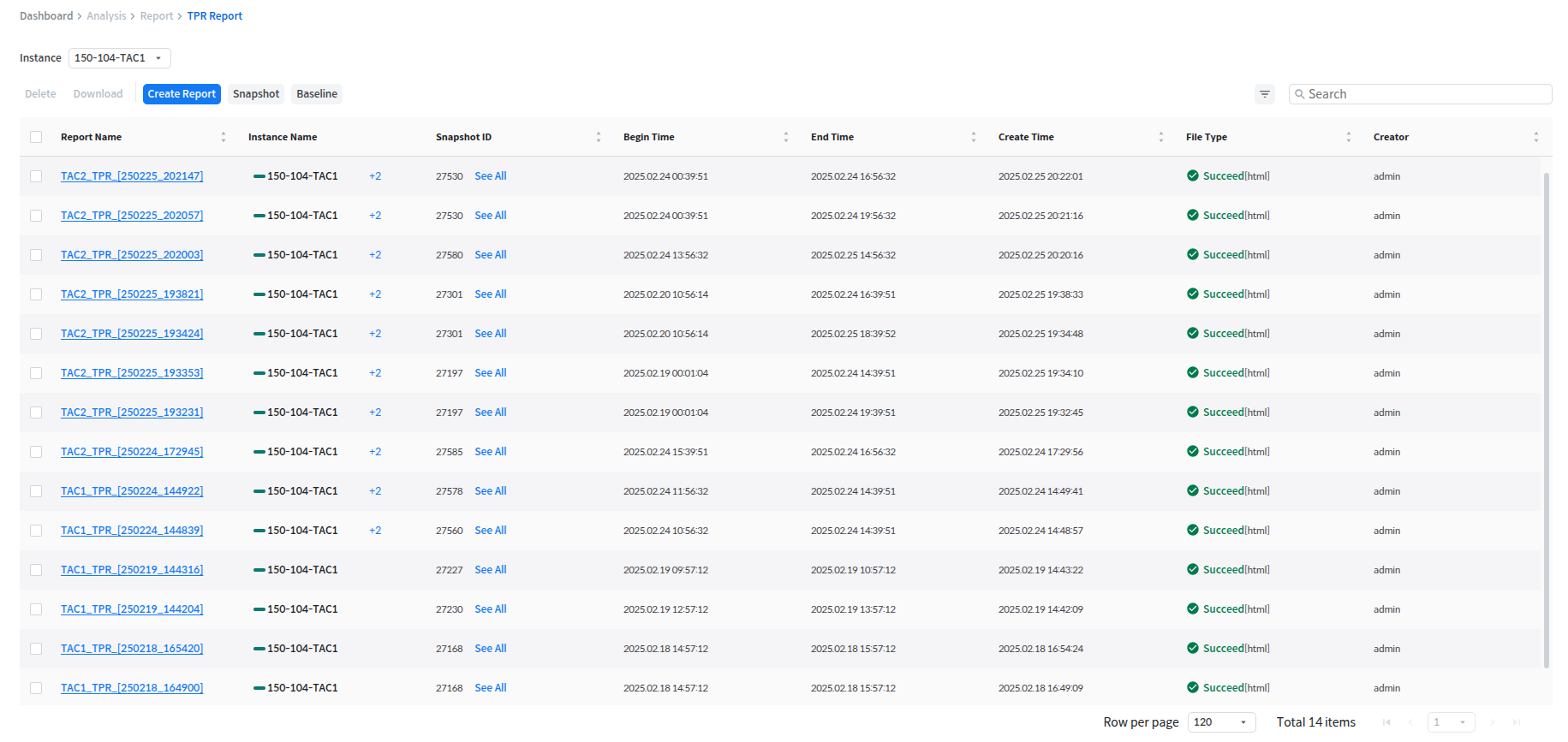 The TPR Report feature allows users to generate and view performance analysis reports for specific instances or clusters based on their permissions. In cluster (TAC, TSC) environments, reports can be generated for individual instances or the entire cluster.