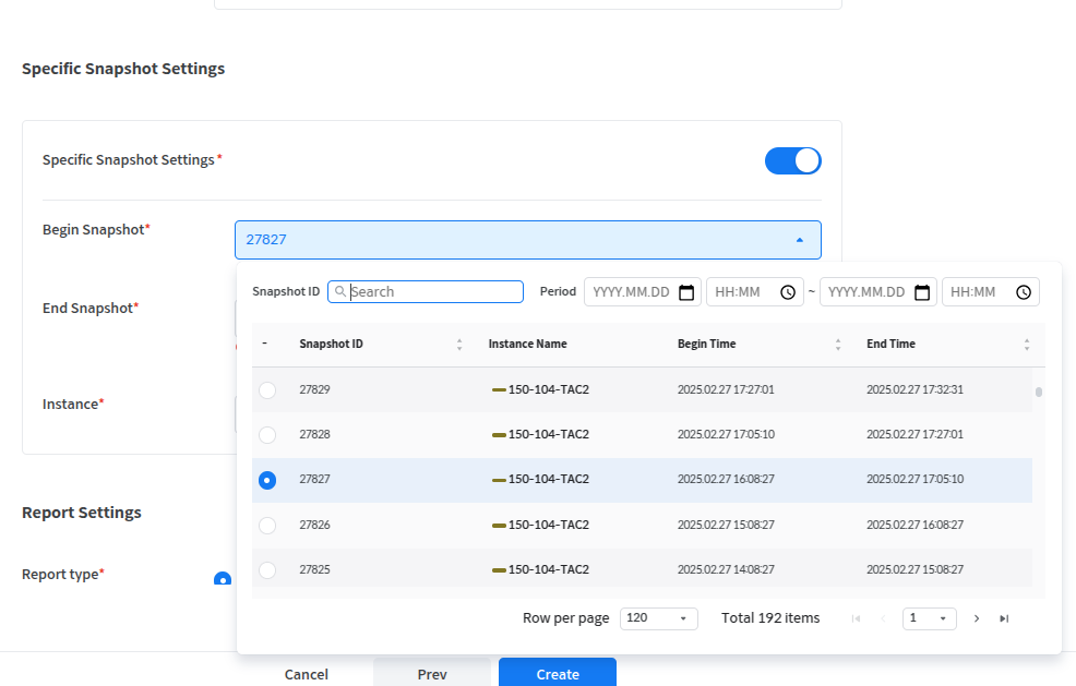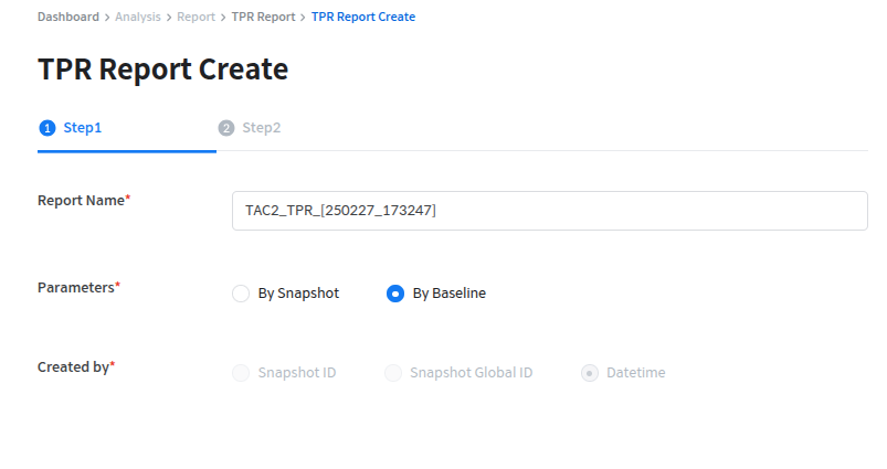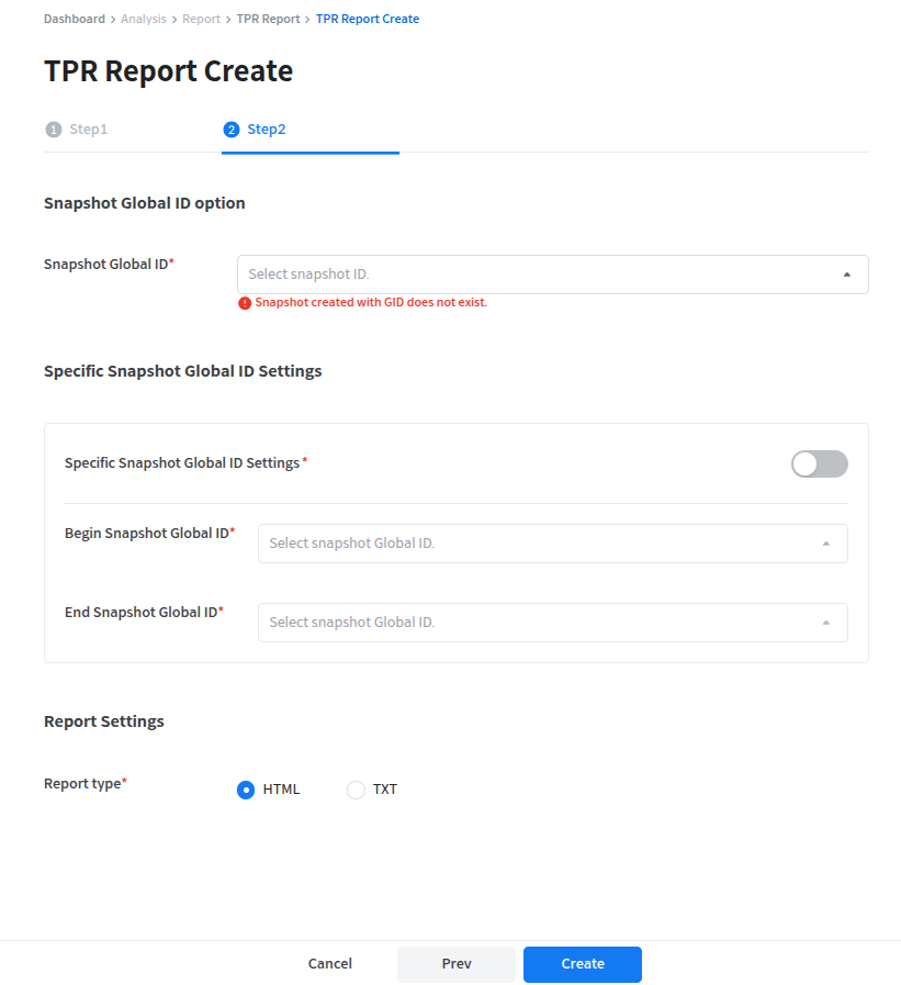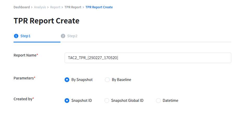 When selecting Snapshot, the users can choose one of Snapshot ID, Snapshot Global ID, or Datetime to generate the TPR report.