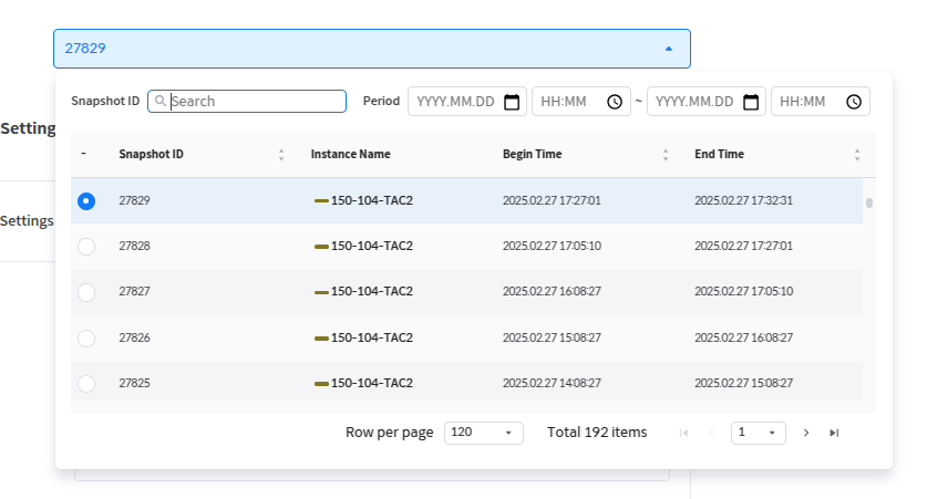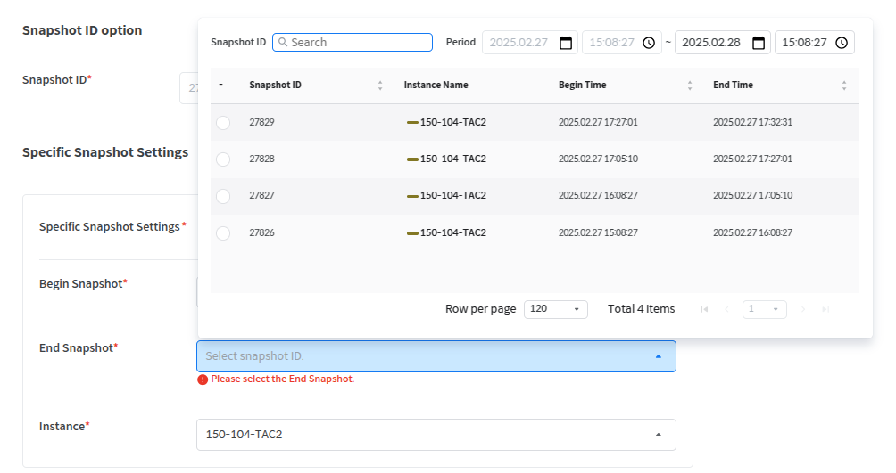 The users can search by selecting the Snapshot ID and time period, and users can select only one item from the snapshot list.