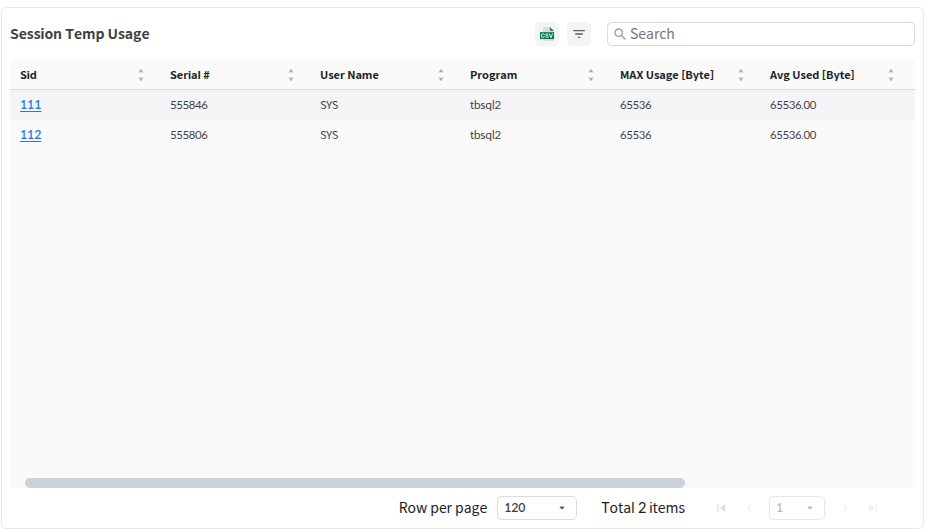 When the users click Sid in Session Temp Usage, the users will be taken to the Temp Detail page.