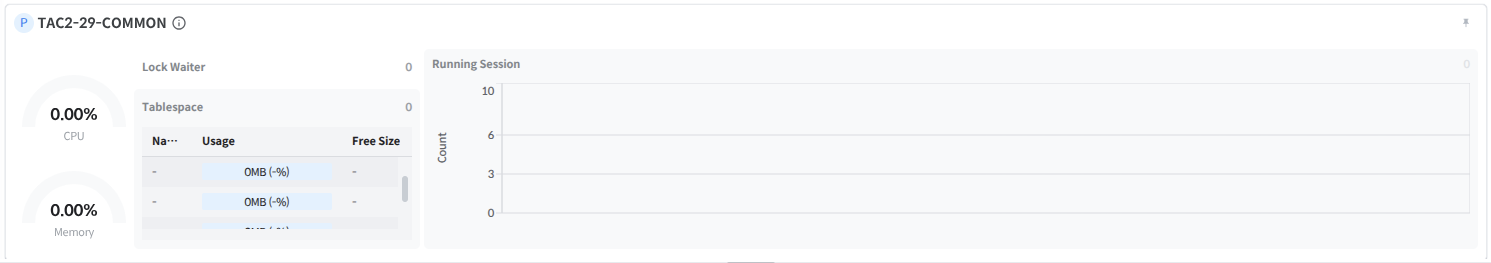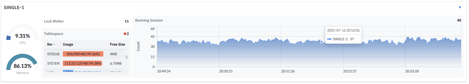 Tablespace: Displays the number of tablespaces with usage exceeding 90%. A scrollable table at the bottom shows the current usage status of tablespaces.