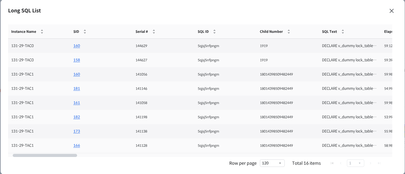 Clicking on the SID of each row allows the users to view the Session Detail and SQL Detail pages.