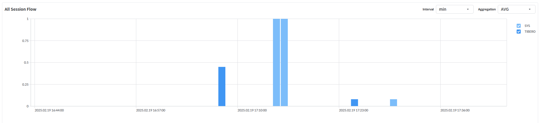 All Session Flow 화면에서는 동일한 DB 사용자는 제외하고, DB 사용자별 전체 세션 갯수를 그래프로 확인할 수 있다. 이이때 오른쪽 상단의 차트 간격(Interval)과 집계 방식(Aggregation)을 드롭다운 메뉴로 선택하여 확인할 수 있다.