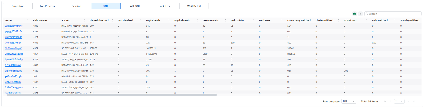 Performance Chart의 SQL 영역에서는 상단의 그래프를 클릭했을 때 해당 구간의 각 세션에서 수행한 SQL 목록을 보여준다. SQL ID 클릭시 해당 SQL 에 대한 SQL Detail 페이지로 전환된다.