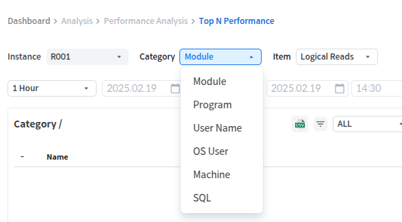 Category와 Item 선택을 통해 모니터링 하고자 하는 기간에서의 성능 지표를 확인할 수 있다. 이때 영역 오른쪽 상단의 콤보박스를 통해 SQL Category를 제외한 Category에 대해 정렬 리스트의 개수(ALL / Top 20 / Top 30 / Top 50)를 지정할 수 있다.
