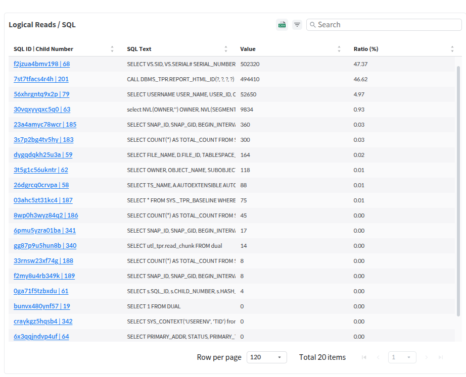 Category / Module에서 발생한 SQL 중 Item(Logical Reads) 값(Value)이 높은 순서대로 출력한다. 이 때 해당 SQL을 더블 클릭하면 SQL Detail 화면으로 넘어간다.