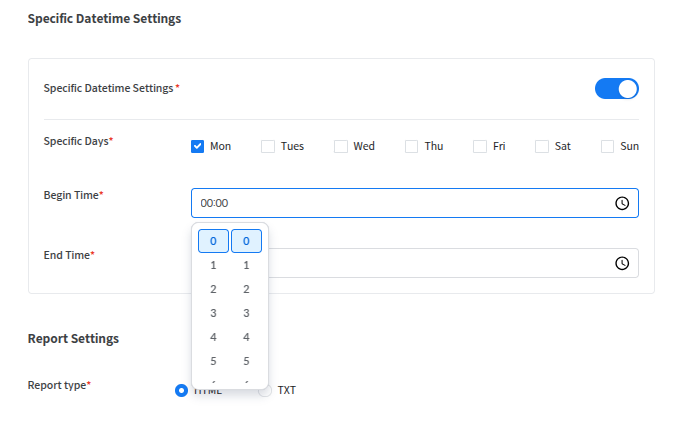 Specific Days로 원하는 날짜를 선택할 수 있으며 Begin Time, End Time으로 원하는 시간대를 설정할 수 있다. 단 Specific Datetime Settings의 Begin/End Time에서는 시간대(24시간 기준, 시, 분 단위까지 설정 가능, 초 단위 설정 불가)만 설정 가능하다.