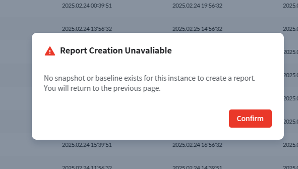 잘못된 Datetime 입력으로 인한 리포트 생성 실패시 Report Creation Unavailable No snapshot exists for this instance to create a report. Please modify the settings or turn off [Specific Datetime Settings]. 위와 같은 알림이 발생한다.