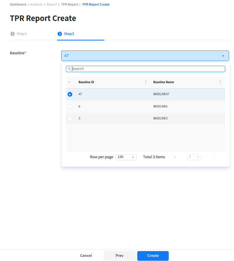 기 생성된 베이스라인중 하나를 선택하여 TPR Report를 생성한다. 베이스라인 리스트에서는 Baseline ID, Baseline Name을 표시하며, 검색 기능을 제공한다 베이스라인으로 추출할 경우 TXT 형식만 지원한다.