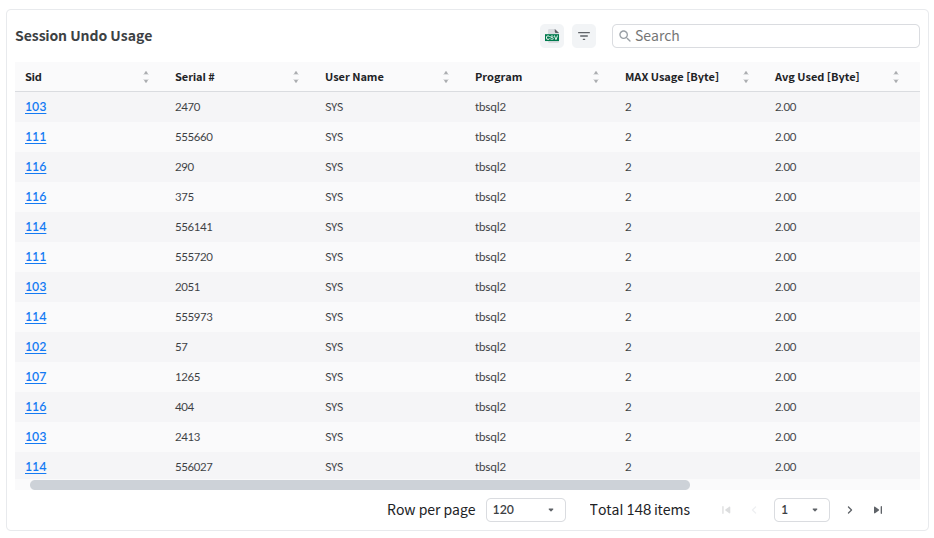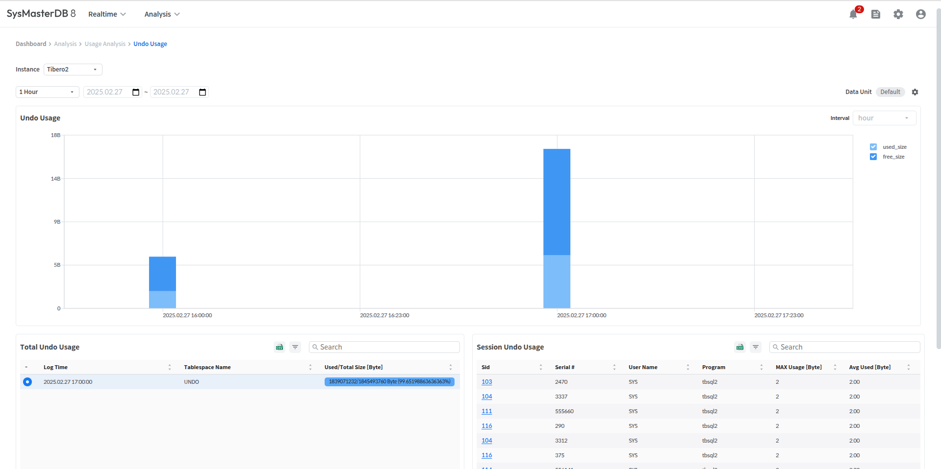 Undo Usage 에서 선택한 항목의 전체 Undo 사용량 정보를 상세하게 확인할 수 있다.