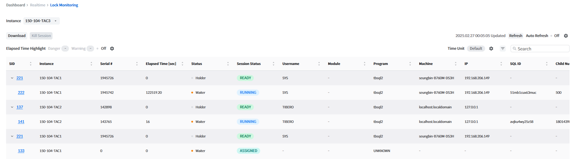 Lock Monitoring 화면에서는 세션간의 Lock 정보를 Tree 형식으로 보여준다. 따라서 Lock을 점유하고 있는 Holder Session과 Lock을 획득하기 위해 기다리고 있는 Waiter Session을 모니터링 할 수 있다. 그리고Lock을 점유하고 있는 세션을 모니터링할 수 있으며, 특정 세션을 종료 시킬 수 있다.