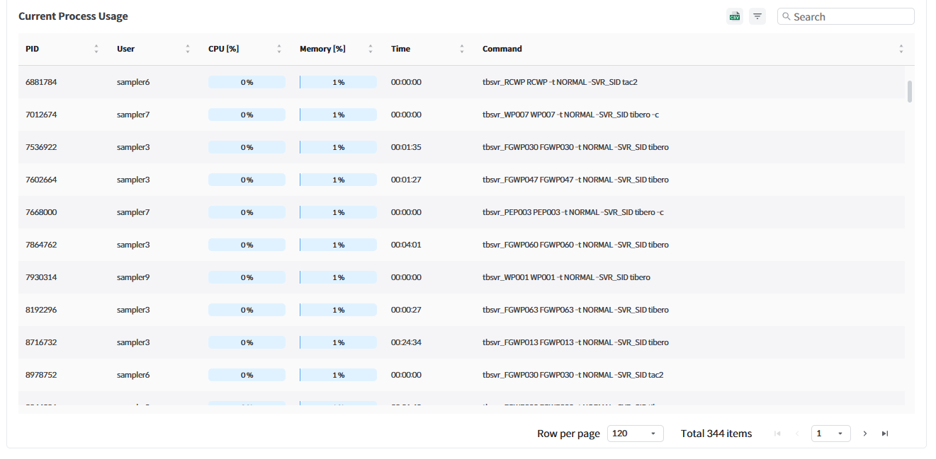 Server Monitoring 페이지에서는 OS Level의 CPU, Memory의 System Resource 사용량과 Process의 CPU 및 Memory 사용량에 대한 정보를 보여준다. 이때 PID, User, CPU(%), Memory(%) 등 각 조건별로 필터링 기능을 제공하며 전체 프로세스가 리소스를 어느 정도 차지하고 있는지 전반적인 상태를 모니터링할 수 있다.
