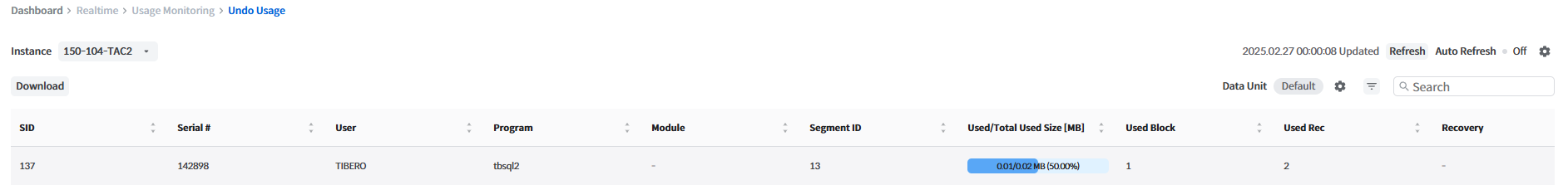 글로벌 내비게이션 바에서 [Realtime] > [Usage Monitoring] > [Undo Usage] 를 클릭하면 Undo Usage 화면이 열린다.
