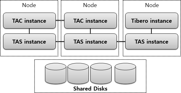 TAS는 공유 디스크를 사용하기 위한 클러스터링 기능을 제공합니다. 하나의 디스크 스페이스는 하나의 Tibero 인스턴스만 사용할 수 있습니다. 여러 Tibero 인스턴스가 하나의 디스크 스페이스를 사용하려면 해당 인스턴스들을 TAC로 구성해야 합니다.