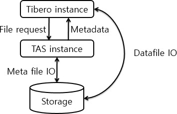 다음 그림은 TAS 인스턴스와 Tibero, 디스크 사이의 관계를 보여줍니다. Tibero는 TAS를 통해서 파일을 읽고 쓰는 것이 아니라, 파일의 메타 정보를 사용해서 직접 디스크를 읽고 씁니다. 이를위해 Tibero는 TAS 로부터 파일의 메타 정보를 받아옵니다.
