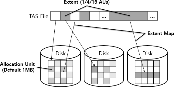 TAS 파일들은 익스텐트들의 집합으로 디스크 스페이스에 저장됩니다. 각 익스텐트는 디스크 스페이스에 속한 각 디스크에 저장되어있으며, 한 개 혹은 여러 개의 할당 단위를 사용합니다. TAS는 큰 크기의 파일을 지원하기 위해 동일 파일 내에서 파일 크기에 따라 익스텐트 크기를 변경합니다.