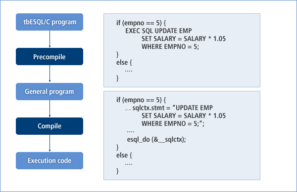 프리컴파일(Precompile) tbESQL/C 프로그램을 작성하여 프리컴파일 과정을 거치고 나면 C 프로그래밍 언어로만 구성된 소스코드가 생성됩니다. 생성된 소스코드는 .c 확장자를 가진 파일의 형태로 저장됩니다.