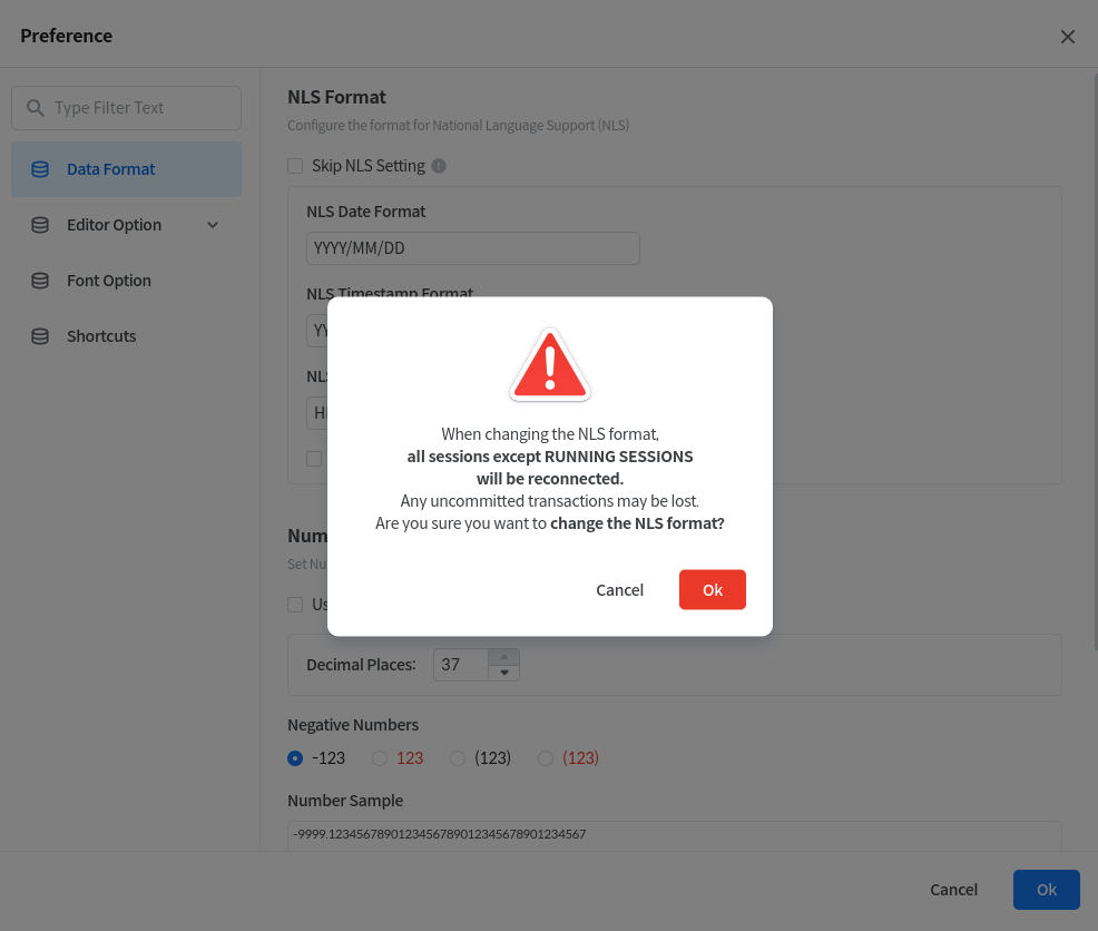 NLS Format can be changed. Changing the NLS format is only available by unchecking the Skip NLS Setting option. At this time, a reconnection notification modal appears, and if the users click the [Confirm] button, all connected sessions except the session that is running to apply NLS Format will be reconnected.
