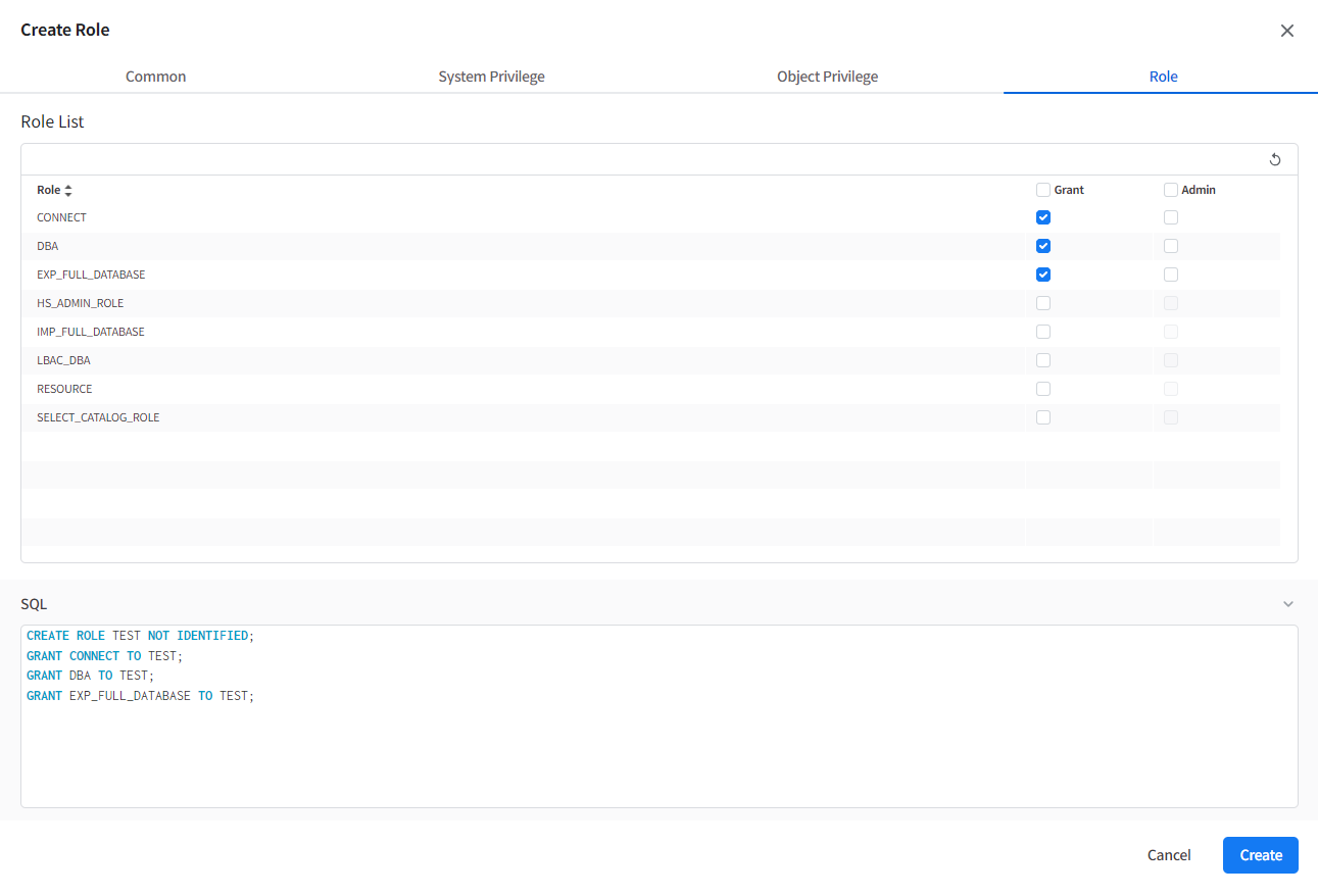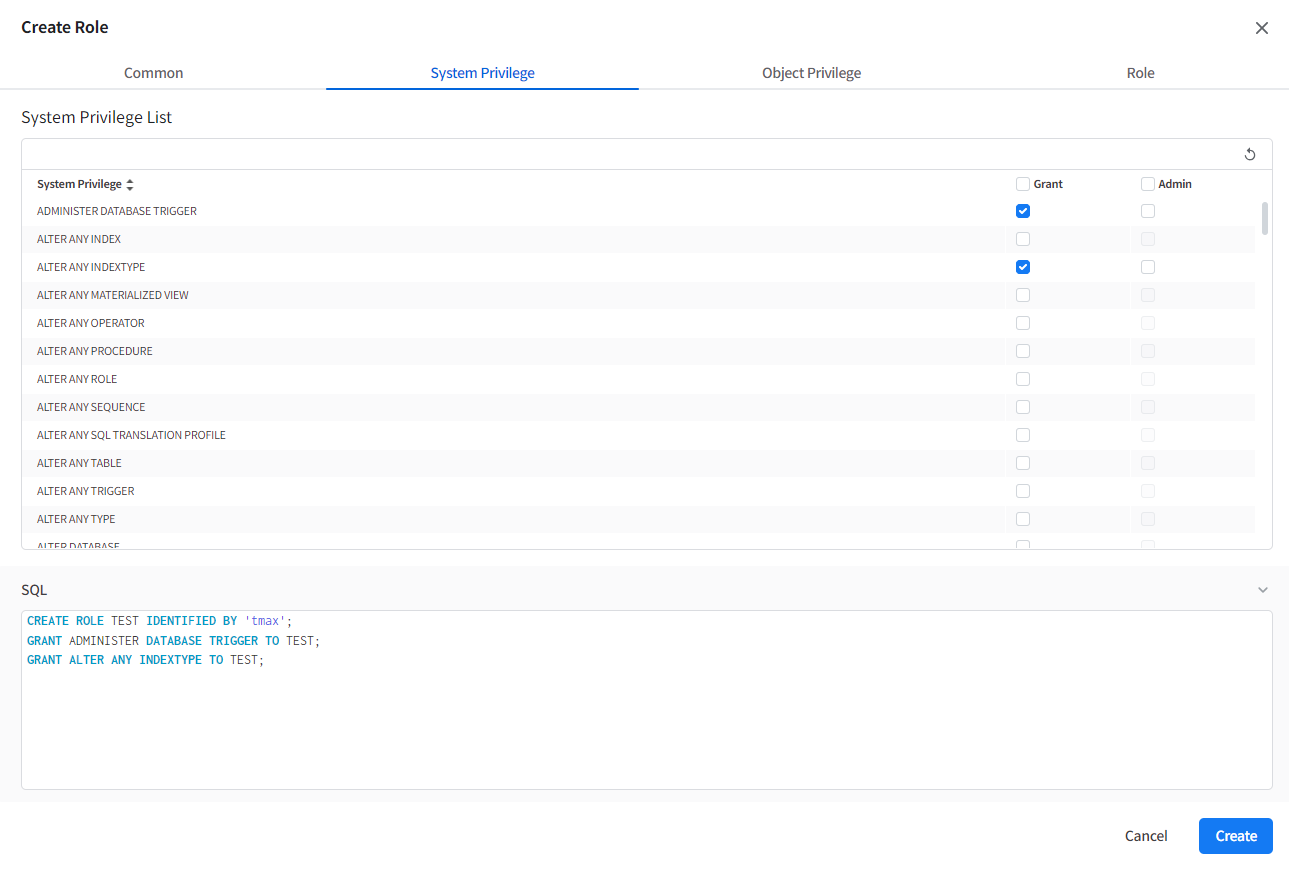 The details can be set in each tab: Common, System Privilege, Object Privilege, Role
