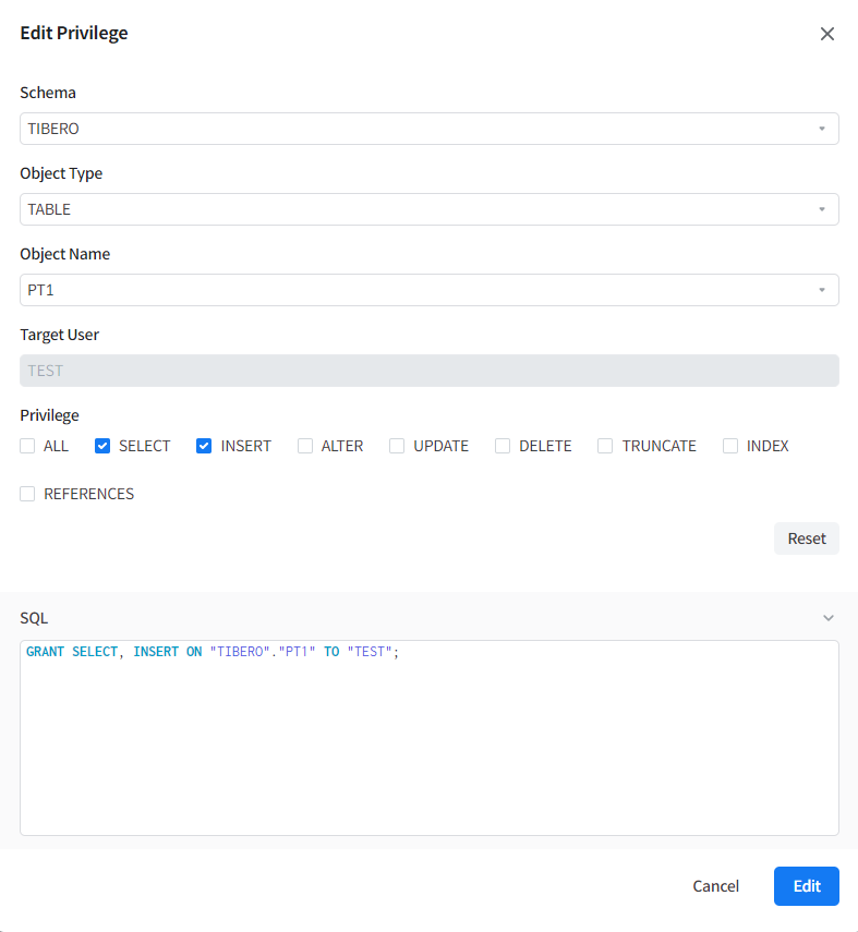 + 버튼을 클릭하면 Edit Privilege 모달이 열리며, 해당 모달에서 Object Privilege를 선택하고 설정할 수 있다.